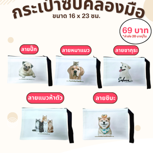 กระเป๋าซิปคล้องมือ สีขาว ลายหมารวมแถว